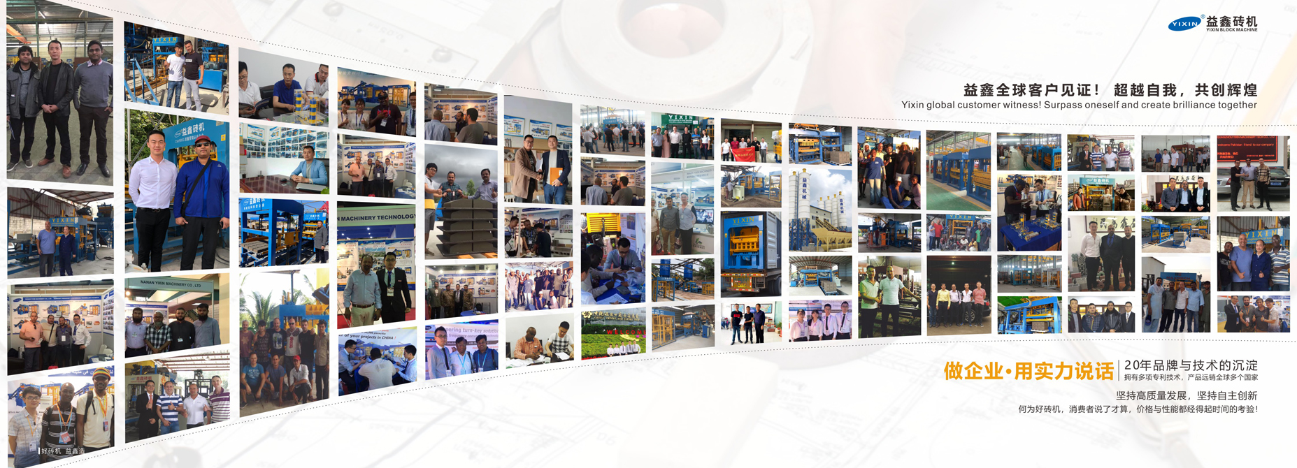 公司創(chuàng)建于九十年代初,是國家高新技術(shù)企業(yè)、福建省科技型企業(yè)、福建省科技小巨人領(lǐng)軍企業(yè)、守合同重信用企業(yè)。公司通過ISO9001:2000版質(zhì)量管理體系認(rèn)證,產(chǎn)品采用國際標(biāo)準(zhǔn)制造,產(chǎn)品通過“CE”認(rèn)證。益鑫磚機(jī)是一家集研發(fā)、生產(chǎn)、銷售為一體的混凝土制品成型機(jī)的專業(yè)廠家。益鑫公司擁有一支研發(fā)實(shí)力強(qiáng)勁的優(yōu)秀隊(duì)伍,目前公司擁有已授權(quán)各項(xiàng)專利技術(shù)數(shù)十項(xiàng),益鑫生產(chǎn)的QT/YX系列混凝土砌塊成型機(jī)經(jīng)過十多年的不斷改進(jìn)和完善,產(chǎn)品規(guī)格齊全、性能可靠、質(zhì)量優(yōu)異、服務(wù)周到及時(shí),廣泛滿足不同用戶的需求,并得到了國內(nèi)外客戶的充分肯定,出口訂單逐年穩(wěn)步增加,國內(nèi)銷量增幅顯著。